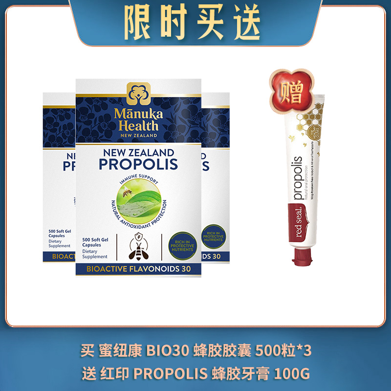 【04.01限时买送】买 蜜纽康 BIO30 蜂胶胶囊 500粒*3 送 红印蜂胶牙膏