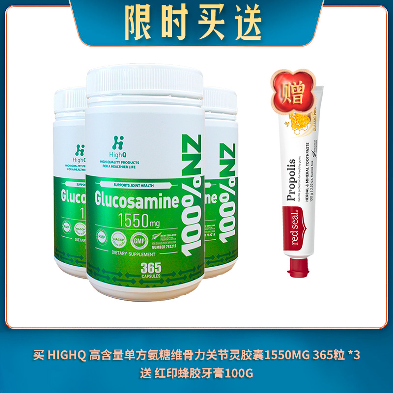【03.31限时买送】买 HIGHQ 高含量单方氨糖维骨力关节灵胶囊1550MG 365粒 *3 送 红印蜂胶牙膏