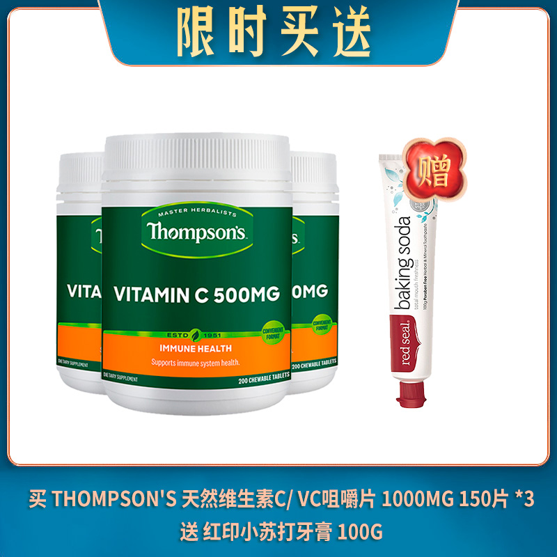 【04.07限时买送】买 THOMPSON'S 汤普森 天然维生素C/ VC咀嚼片 1000MG 150片 *3 送 红印小苏打牙膏 100G