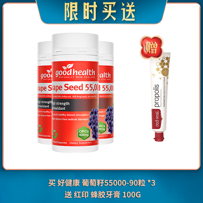 【04.07限时买送】买 GOODHEALTH 好健康 葡萄籽55000-90粒 *3 送 RED SEAL 红印 PROPOLIS 蜂胶牙膏 100G