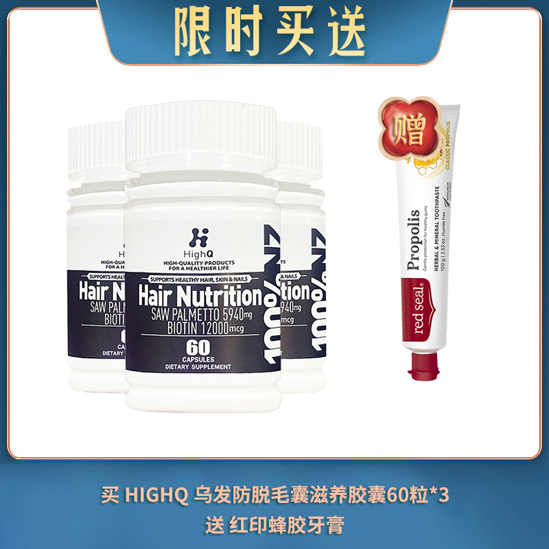 【04.16限时买送】买 HIGHQ 乌发防脱毛囊滋养胶囊60粒 强韧黑发版(120000MCG) *3 送 红印蜂胶牙膏