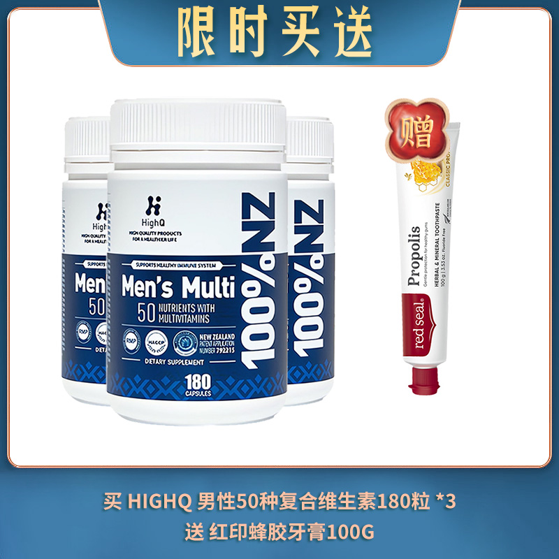 【03.23限时买送】买 HIGHQ 男性50种复合维生素180粒 *3 送 红印蜂胶牙膏
