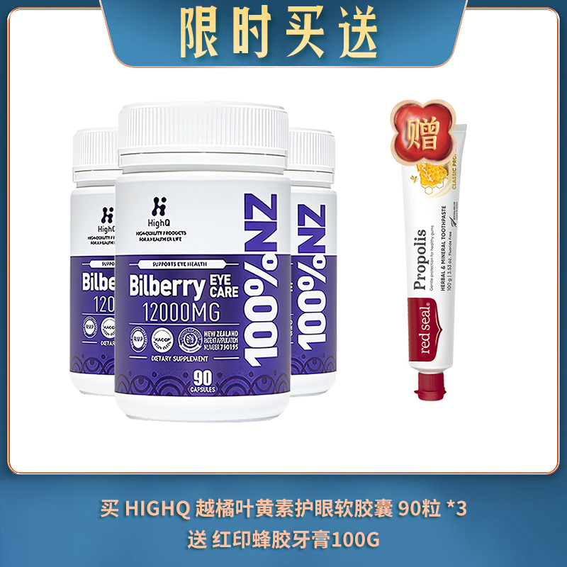 【03.23限时买送】买 HIGHQ 越橘叶黄素护眼软胶囊 90粒 *3 送 红印蜂胶牙膏