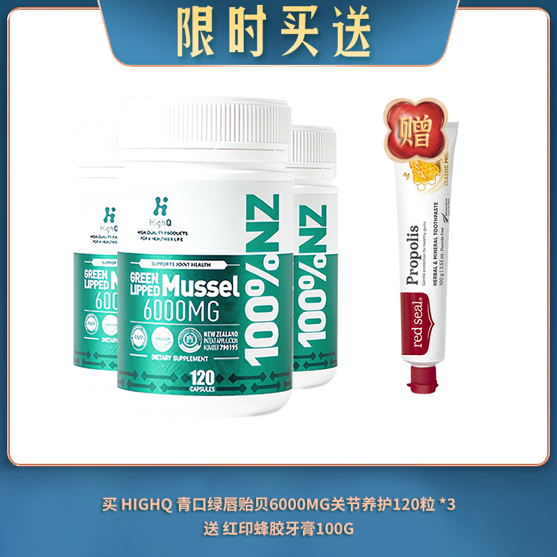 【03.23限时买送】买 HIGHQ 青口绿唇贻贝6000MG关节养护120粒 *3 送 红印蜂胶牙膏